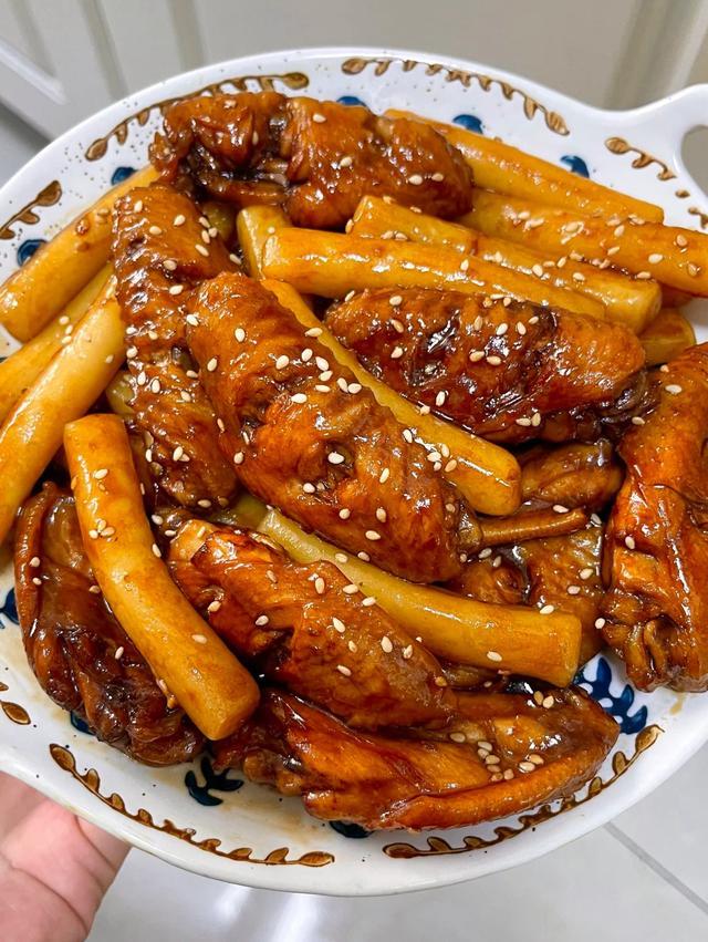 收汁时要不停地晃动锅底,防止糊锅。直到汤汁变得浓稠红亮,紧紧包裹在鸡翅和年糕上,即可出锅,撒上白芝麻点缀。